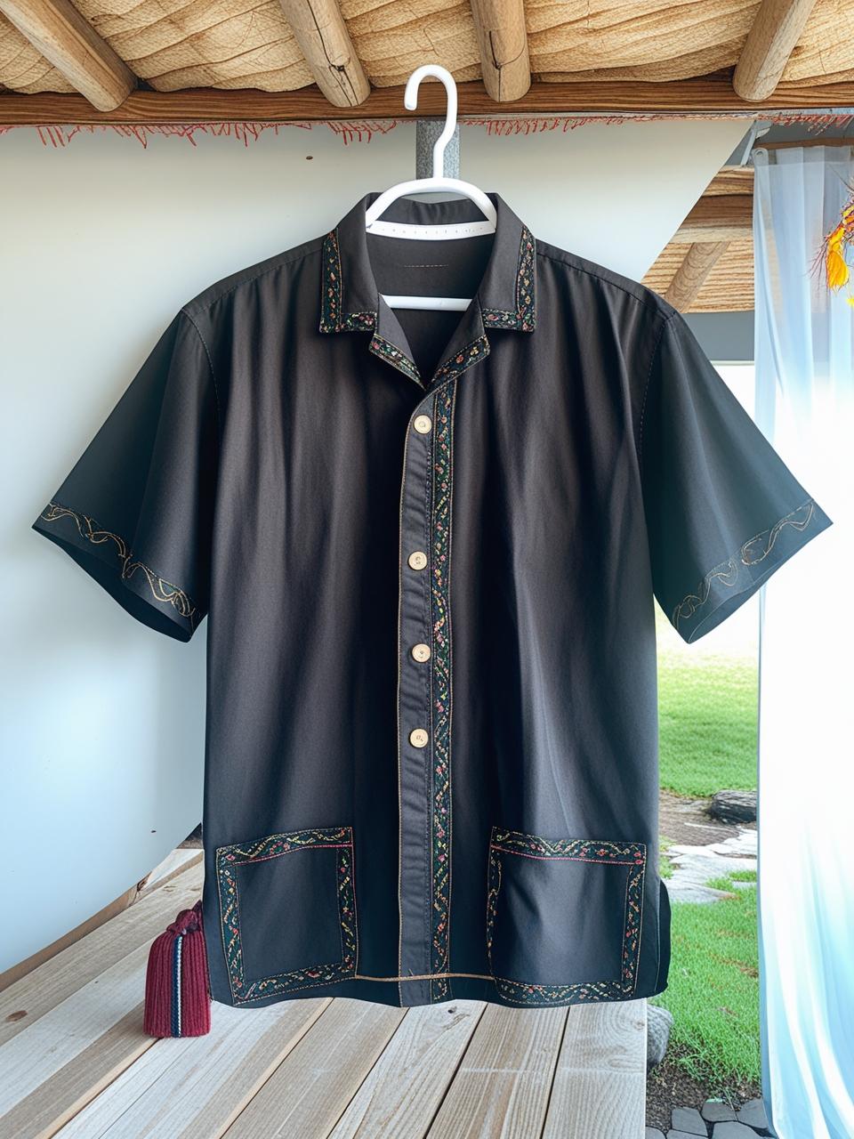 เสื้อผ้าฝ้ายทอมือแขนสั้น สีกรม (น้ำเงินเข้ม) ตัดเย็บอย่างประณีตด้วยฝีมือชุมชน 👩🌾